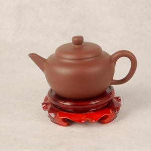 以小煤窑朱泥制潘壶,经典中的经典。此壶身扁似柿饼,色泽红润可爱,工艺水准无可挑剔;壶嘴、壶把与壶钮三点一线,且各处明针处理完美,壶身刻绘装饰,一面是题词“一壶香茗伴桐君”,下笔深刻,刀工深厚;一面是鲜花飞鸟,活泼生动,跃然纸上。诗、画、艺术三者融合,实乃佳作。